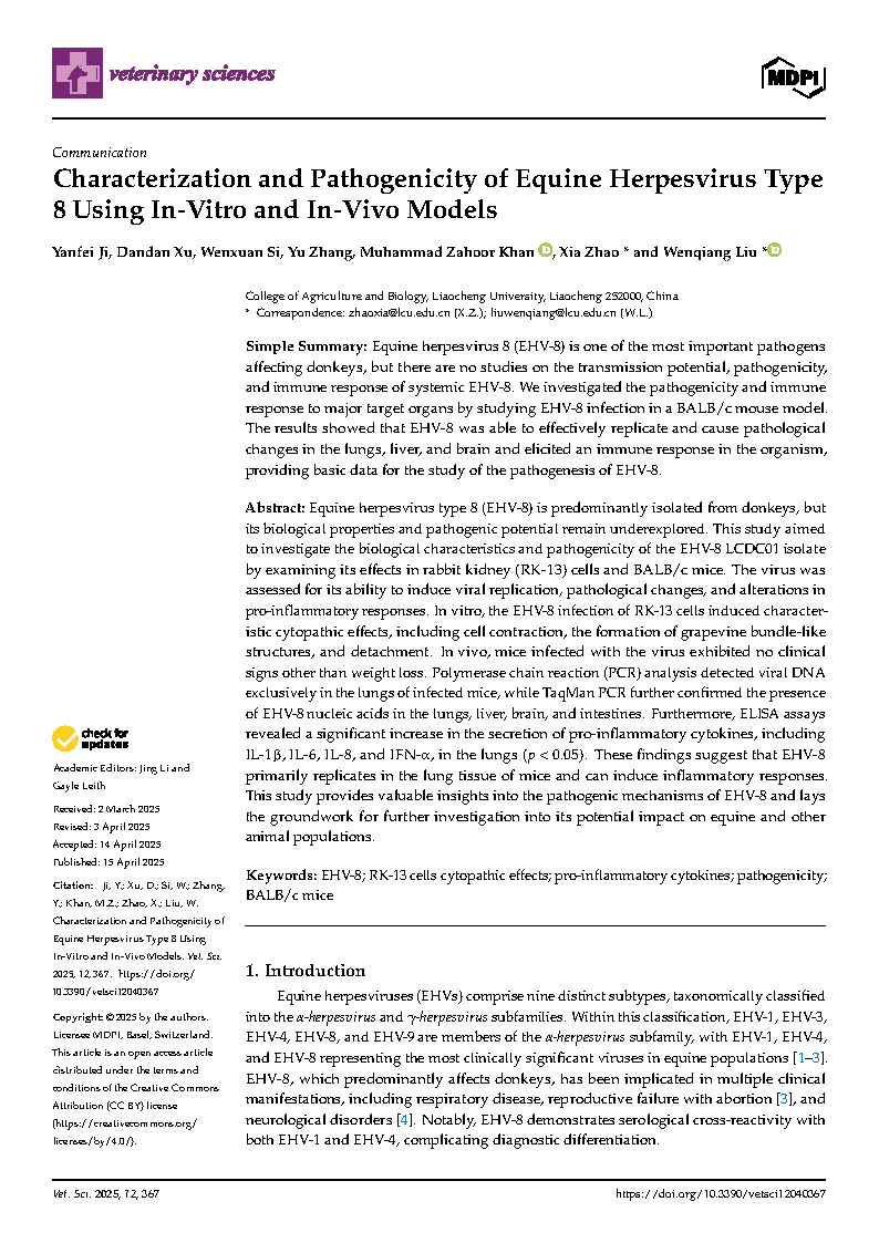 开元官网2022级动物学专业研究生纪言霏在《Veternary Science》杂志上发表了题为“Characterization and Pathogenicity of Equine Herpesvirus Type 8 Using In-Vitro and In-Vivo Models”的研究论文,指导教师为刘文强教授、赵霞博士。