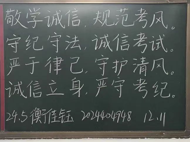 为加强学风建设,严肃考风考纪,引导学生树立正确的价值观和考试观,提升学生的诚信意识和自律能力,为即将到来的各类考试营造一个公平、公正、诚信的良好氛围。Ky开元集团于12月11日举办“明考纪,肃考风”黑板字书写活动活动。