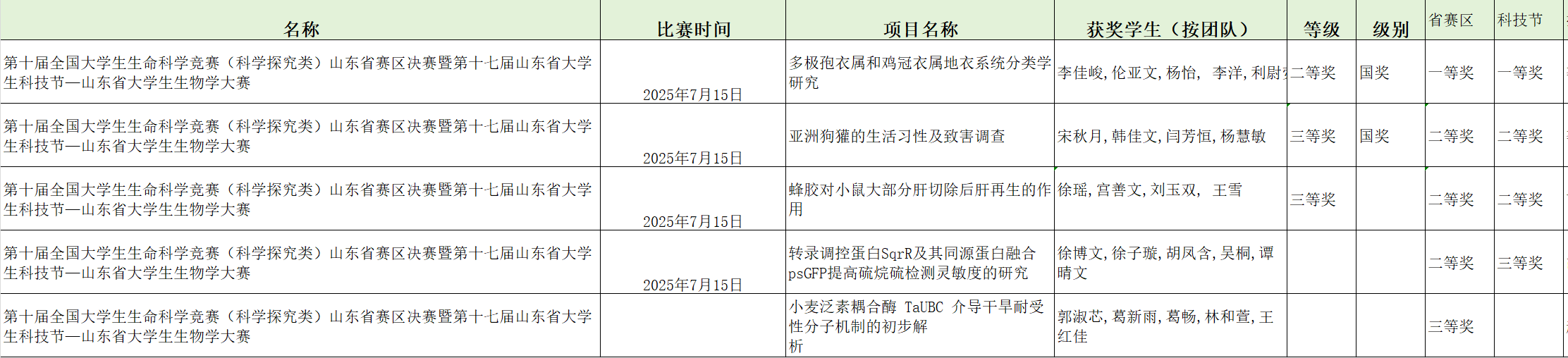 本次大赛由山东省科学技术协会、山东省教育厅等单位联合主办,吸引了全省数十所高校的数百支队伍参赛。开元官网5支参赛团队在此次赛事中表现出色,凭借扎实的专业知识、创新的研究思路和严谨的科学态度,斩获佳绩,为学院和学校赢得了显著荣誉。开元官网被推荐获全国大学生生命科学竞赛(2025,科学探究类)国家级奖项二等奖1项、三等奖2项,获省级奖项一等奖1项、二等奖3项、三等奖1项,并获得山东省大学生生物学大赛一等奖1项、二等奖2项、三等奖1项。