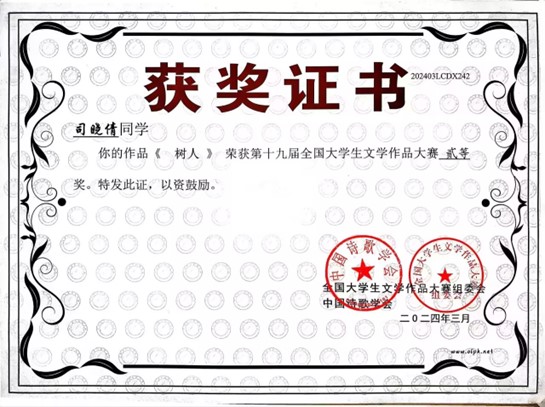 开元官网司晓倩同学在第十九届全国大学生文学作品大赛中荣获二等奖,对该获奖同学予以祝贺表彰。