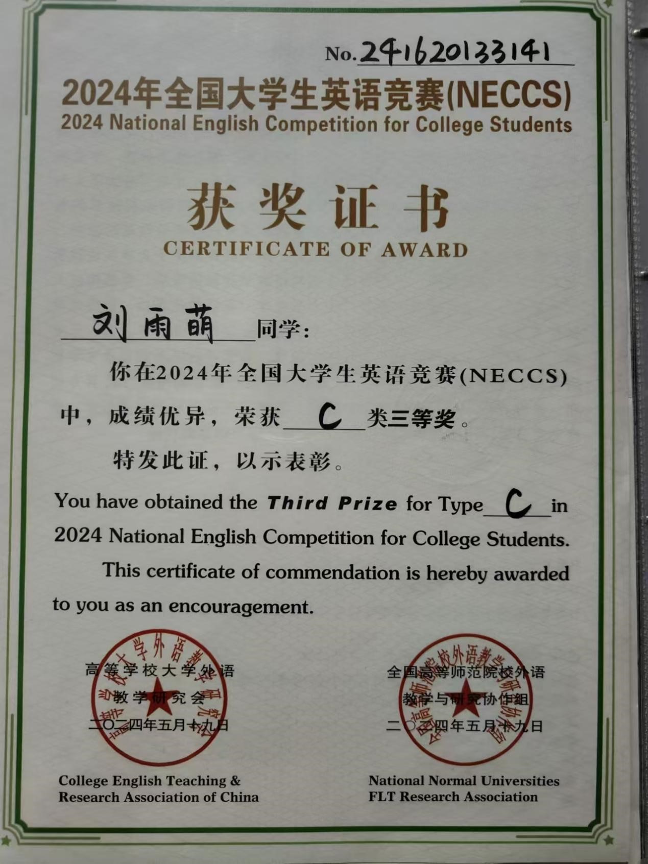 开元官网刘雨萌同学在2024年全国大学生英语竞赛(NECCS)中,成绩优异,荣获C类三等奖,对该获奖同学予以祝贺表彰。