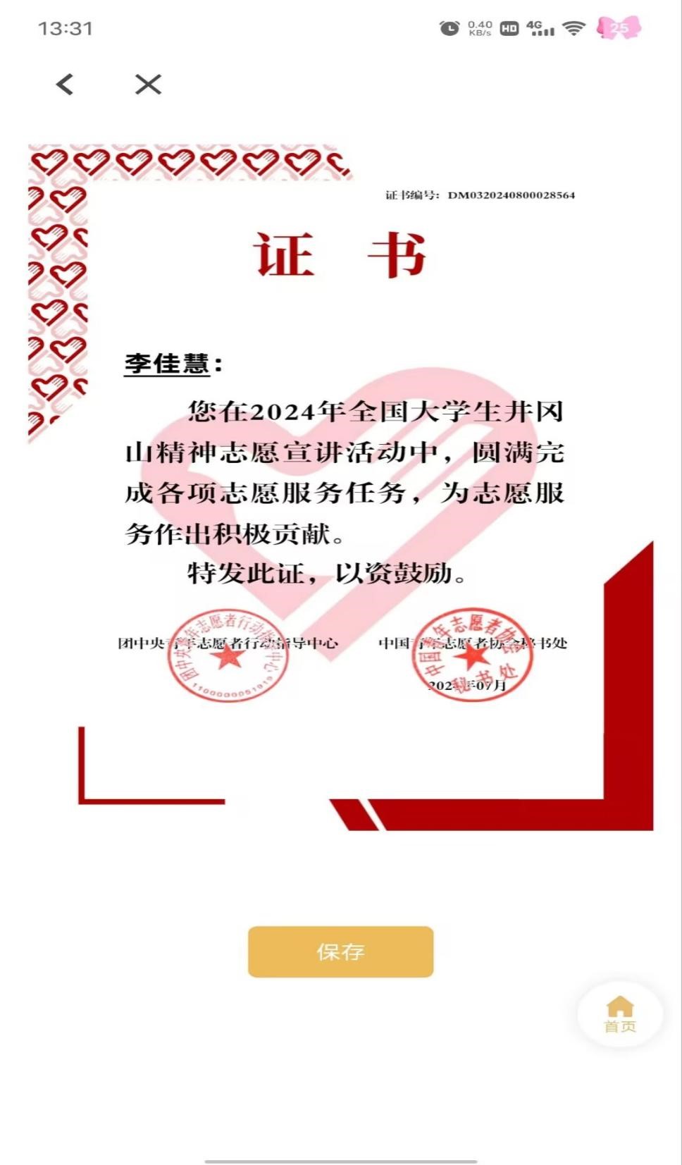 开元官网李佳慧同学在2024年全国大学生井冈山精神志愿宣讲表现优秀,对该同学予以祝贺表彰。