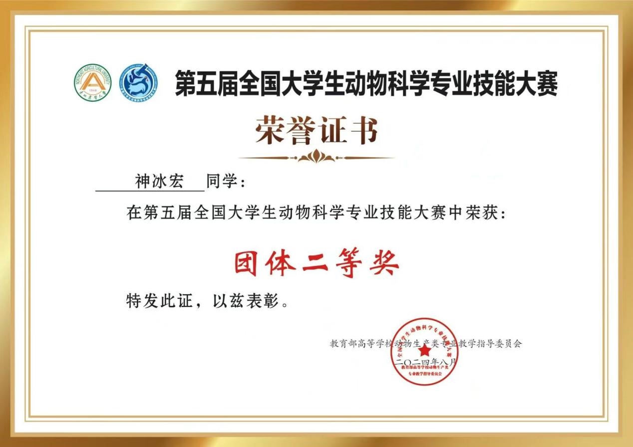 开元官网神冰宏同学在第五届全国大学生动物科学专业技能大赛中荣获二等奖,对该获奖同学予以祝贺表彰。