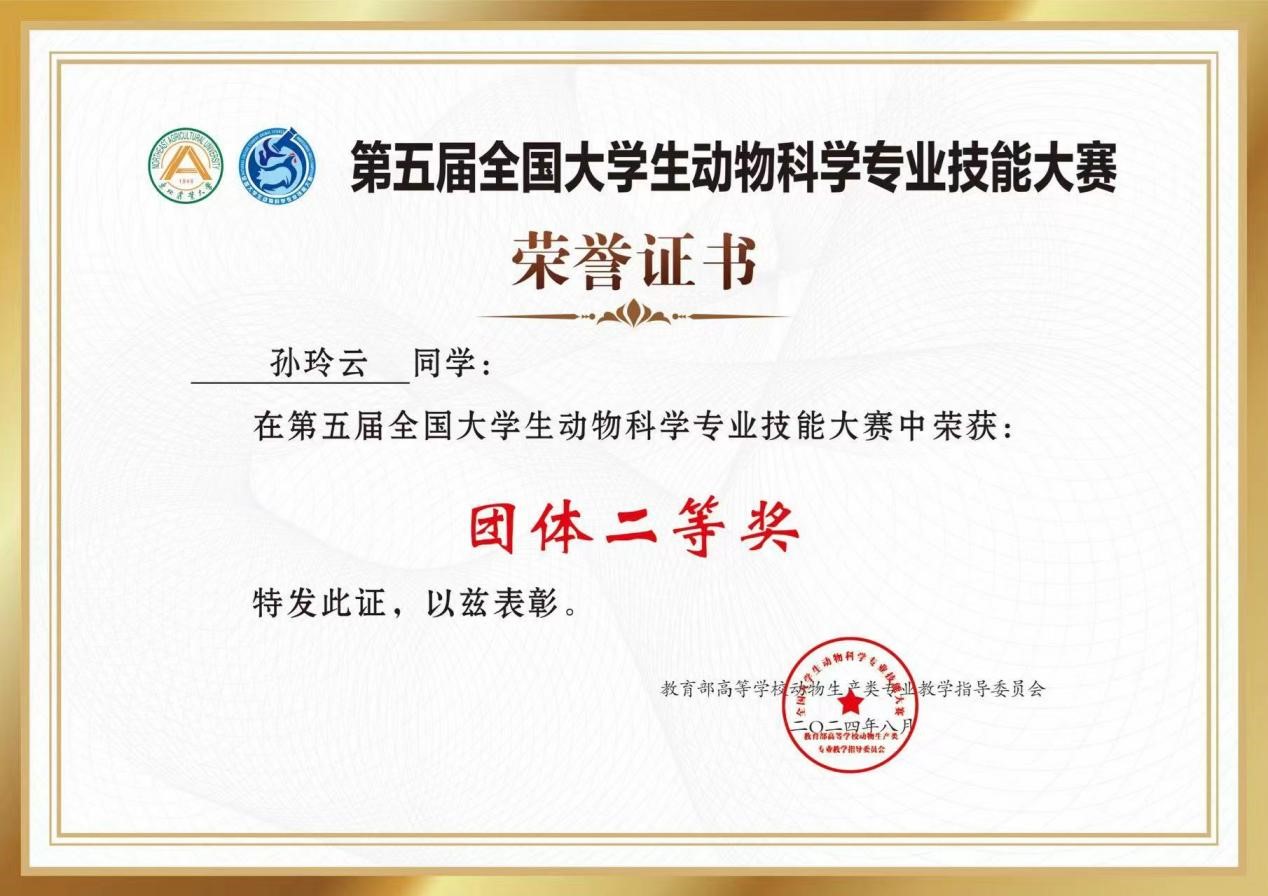 开元官网孙玲云同学在第五届全国大学生动物科学专业技能大赛中荣获二等奖,对该获奖同学予以祝贺表彰。