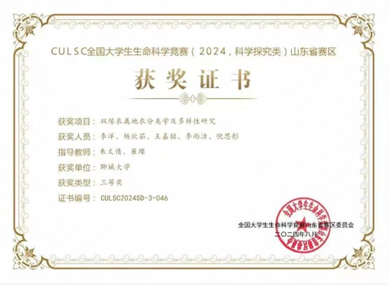 开元官网王嘉铭同学在CULSC全国大学生生命科学竞赛(2024,科学探究类)山东省赛区中荣获三等奖,对该获奖同学予以祝贺表彰