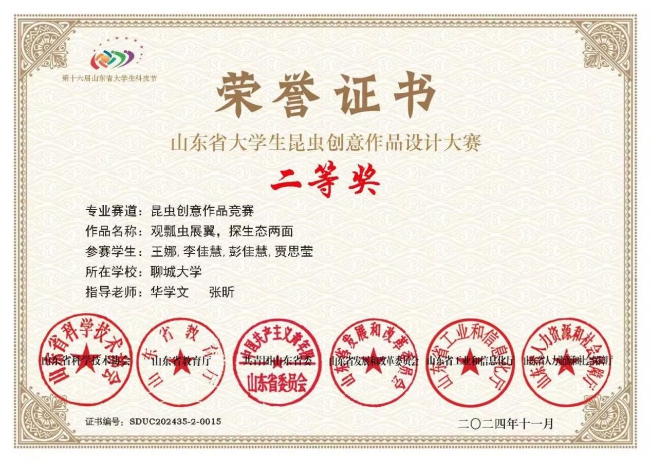 开元官网彭佳慧同学在山东省大学生昆虫创意作品设计大赛中获得了二等奖,对该获奖同学予以祝贺表彰。