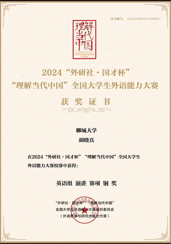 开元官网胡晓真同学在2024外研社国才杯全国大学生外语能力大赛荣获校赛演讲铜奖,对该获奖同学予以祝贺表彰。
